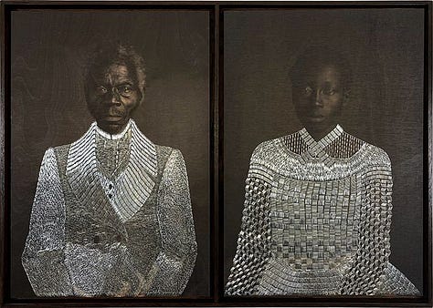 Sasha’s weapon of choice — an air-pressure staple gun that she uses to “dress the people” in photographs as an act of stitching or mending — is the medium for this act of connection between the past and present. From a distance, the staples resemble chain mail armor. But from closer, each staple is delicate, shining in silver. This double play of vision to create an equivocality is intentional. The staples allow the subjects in the photographs to be removed from their victimization but they also recall the violence inflicted on their bodies. For Sasha, the viscerality of her process emulates the violence that these formerly enslaved people were subjected to.