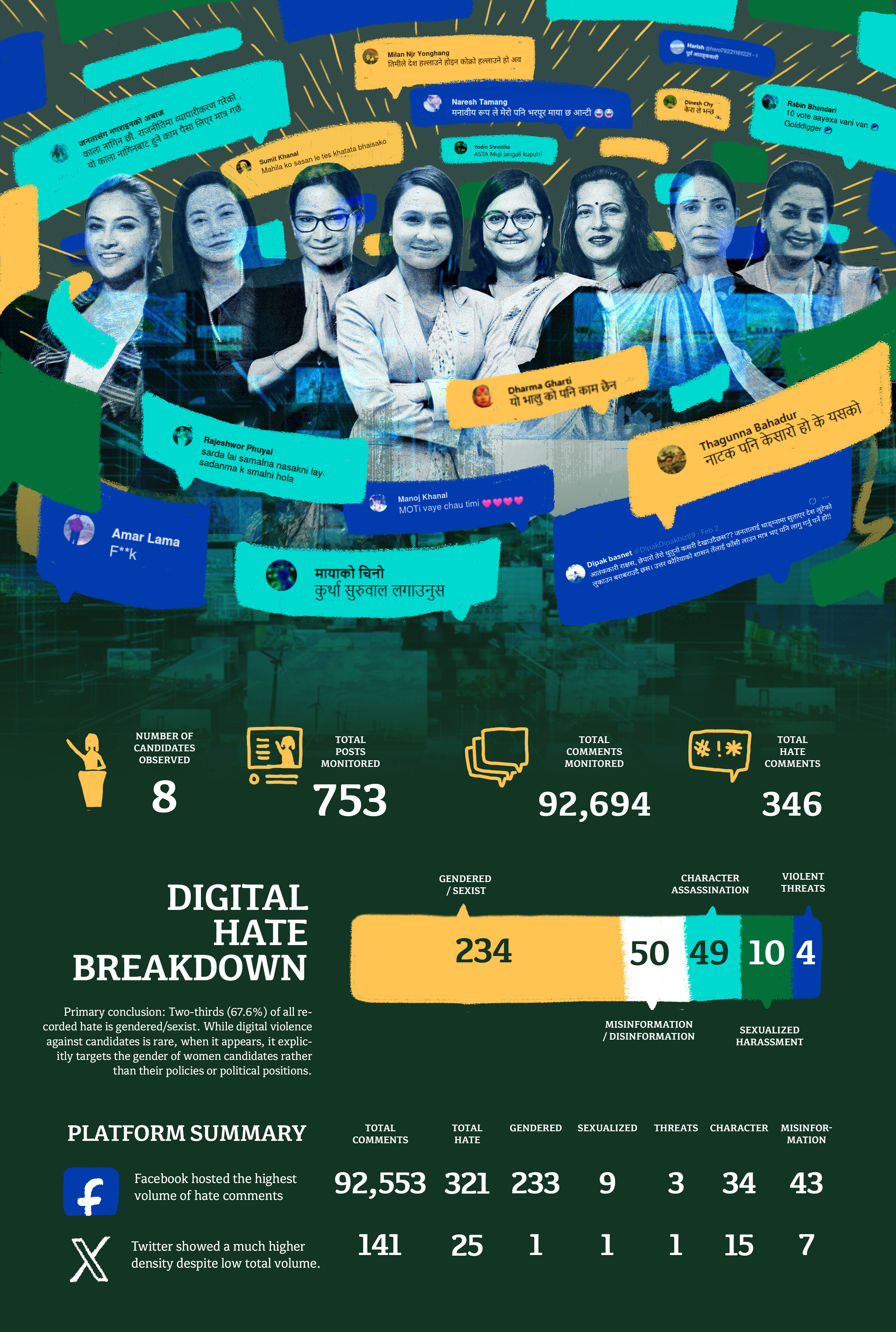 To assess the volume and severity of online gender-based violence against women candidates, Kalam Weekly monitored the social media posts of eight prominent women candidates from across multiple parties — Nisha Adhikari (GLP), Renu Dahal (Nepali Communist Party), Ranju Darshana (Rastriya Swatantra Party), Nisha Dangi (Rastriya Swatantra Party), Bina Magar (Nepali Communist Party), Nanu Bastola (Nepali Congress), Juli Kumari Mahato (CPN-UML), and Mahalaxmi Upadhyay (Nepali Congress) – from the beginning of January to mid-February. We analyzed 753 posts by these candidates on Facebook and X (Twitter), which generated 92,694 comments. We looked primarily for hate speech, divided into five different categories — gendered/sexist comments, targeted misinformation/disinformation, character assassination, sexualized harassment, and violent threats.