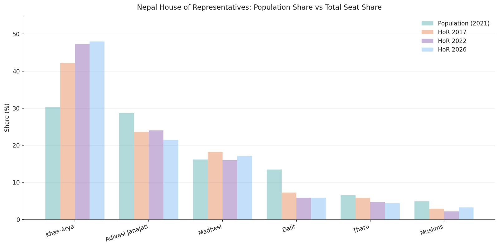 (Image: The graph is based on reports from the Nepal Madhesh Foundation’s 2026 analysis of FPTP candidates and election results, Nepal News’ 2026 FPTP cluster counts and latest inclusion shares, ekantipur’s report on the amended 2026 PR quota schedule, Rising Nepal’s report on the final 2026 PR women count, Samsad Journal’s 2022 House of Representatives FPTP, PR, and total cluster table, The Record’s 2017 House of Representatives representation analysis, and the National Census 2021.)