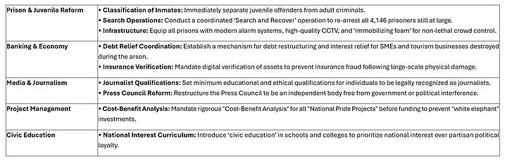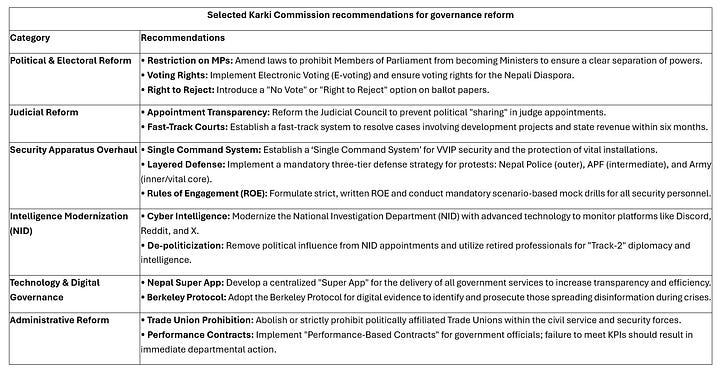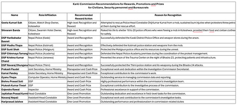 Because the report has identified deep structural issues like poor governance and corruption as the root causes of the protests, it has pages after pages of recommendations for all manner of governance reform, from political and electoral reform to banking and civic education in schools. This may have been beyond the commission's scope, as its recommendations are very broad and affect nearly all aspects of society. The report has also pointed out the role that misinformation played in inciting violence and has named numerous individuals, including journalist Dil Bhusan Pathak, who spread misinformation that directly contributed to the burning down of the Hilton Hotel, and YouTube content creator Tanka Dahal, who amplified misinformation that over 30 protesters had been shot dead and hidden inside the Parliament building on September 8. A selected summary of the broad governance reforms recommended by the report is in the table below. Click to enlarge.