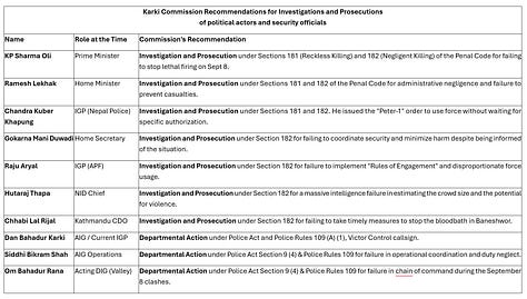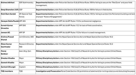 The report holds then Prime Minister Oli, then Home Minister Lekhak, and Inspector General Chandra Kuber Khapung as ultimately responsible. Contrary to the Jana Astha story, it does not recommend 10-year jail sentences for the three, but rather that the government investigate and prosecute them under Sections 181 (reckless killing) and 182 (negligent killing) of the National Penal Code. Four others — Home Secretary Gokarna Mani Duwadi, Inspector General of the Armed Police Force Raju Aryal, Kathmandu Chief District Officer Chhabi Lal Rijal, and National Investigation Department Chief Hutaraj Thapa — are cited for gross failures in security and intelligence and recommended for investigation and prosecution under Section 182 (negligent killing).